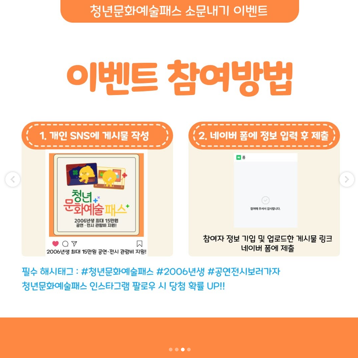 2. #청년문화예술패스 #2006년생 #공연전시보러가자 해시태그 설정 후 업로드.