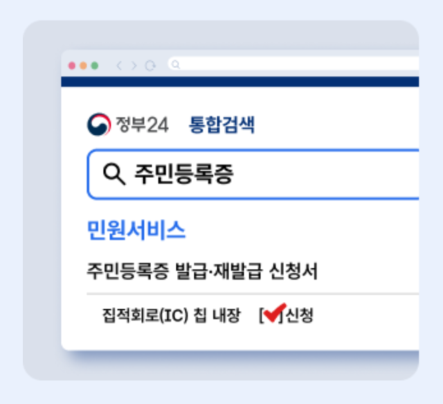 - 주민센터를 방문(또는 '정부24' 3월 28일부터 가능)하여 IC 칩이 내장된 주민등록증을 신청